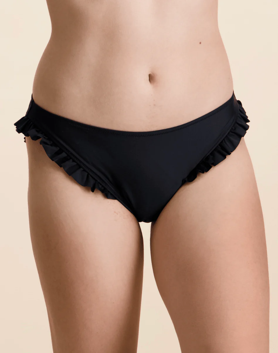 Retrouve dans cet ensemble de bain un haut maillot de bain triangle avec coques amovibles, et un bas de maillot de bain menstruel Brooke, avec ses jolis volants sur les hanches.